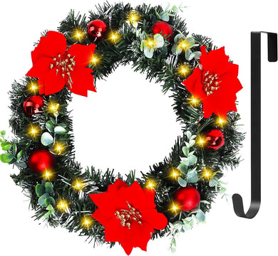 Christmas Wreath New Year Wreath Artificial Door Wreath with 30 LED Lights and Hanger, Wreath for Front Door, Window, Fireplace, Pretty Outdoor Light Up Wreath for Holiday Home Decoration