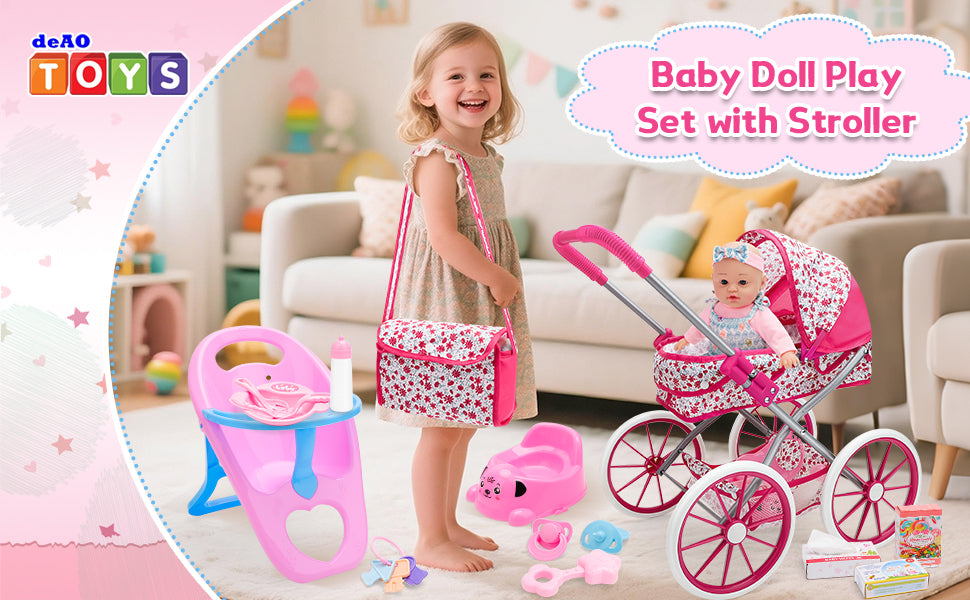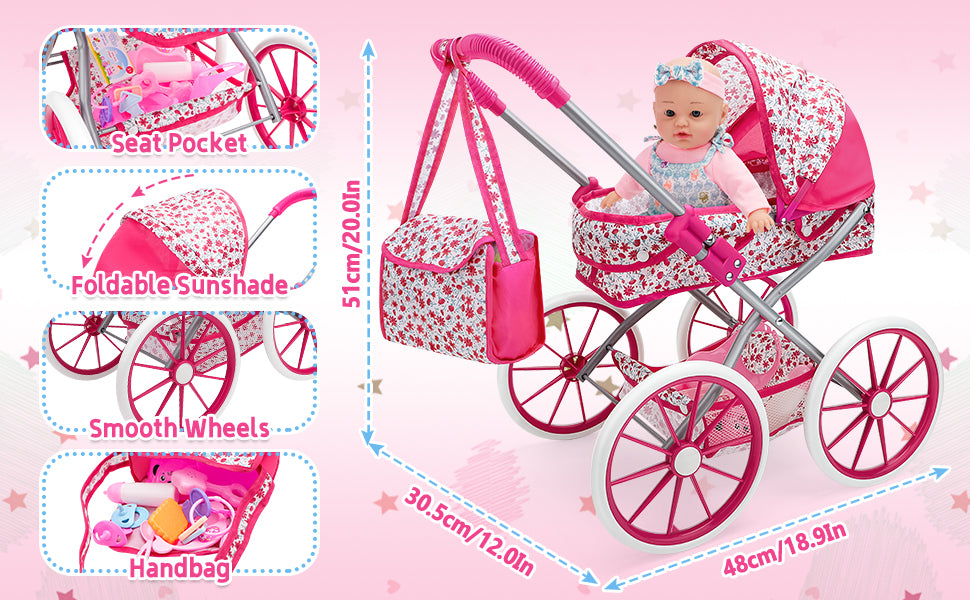 ENDLESS FUN FOR KIDS: This delightful baby doll accessory set is the perfect addition to your child¡¯s doll collection. It includes a soft-bodied doll, a stylish pink pram, a change of clothes, feeding accessories, and essential care items for a fully immersive playtime experience.