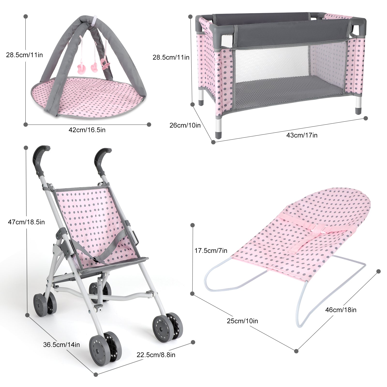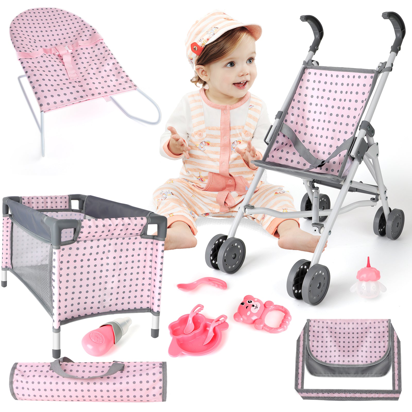 Pretend Play Deluxe Set: A 5-in-1 set designed for imaginative role-play, featuring a baby stroller, play mat, doll bed, bouncer, two travel bags, and a variety of feeding accessories. Perfectly sized for 12", 13", and 14" dolls (doll not included).