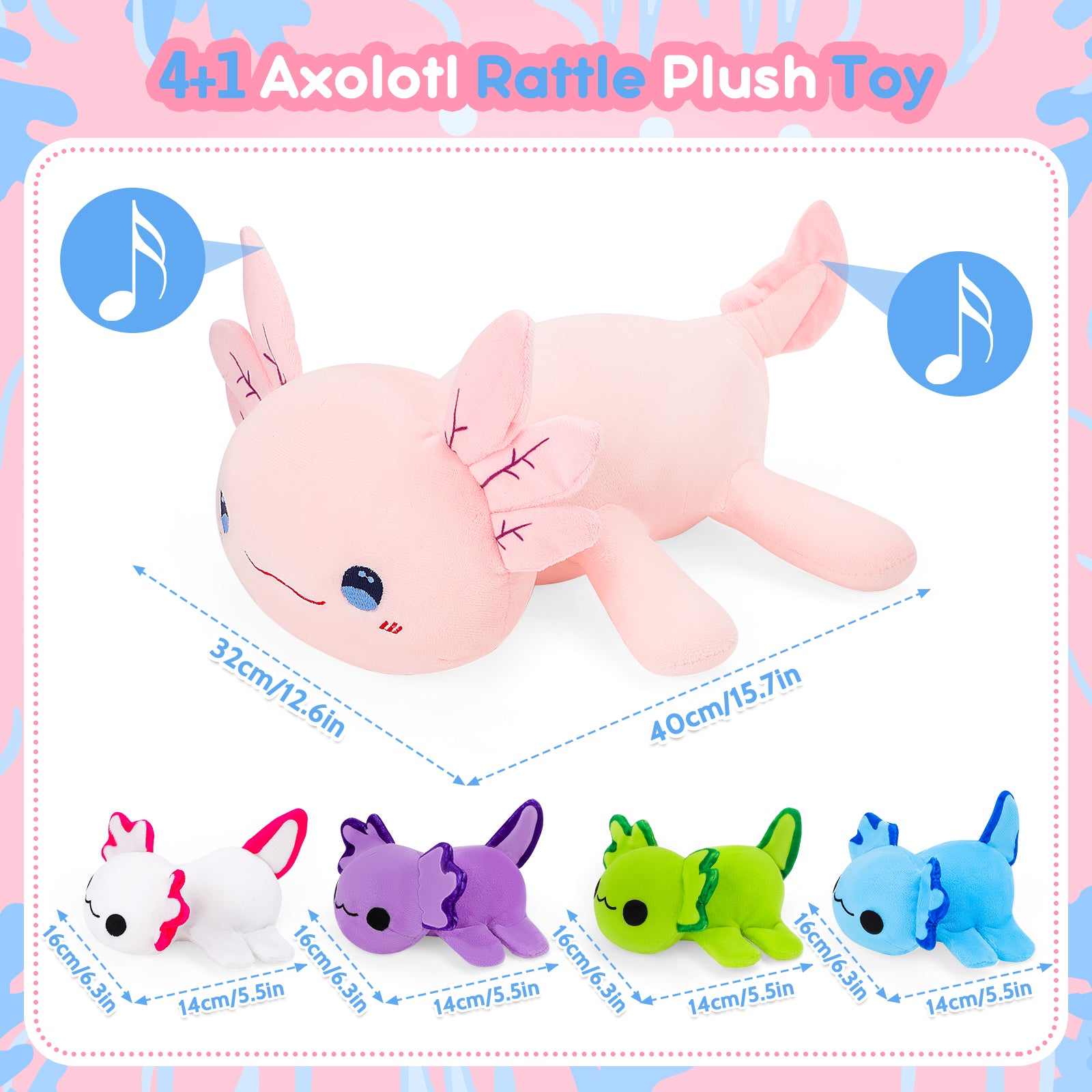This fun design features one large axolotl plush toy and four plush axolotl bracelets, making it fun and interactive.