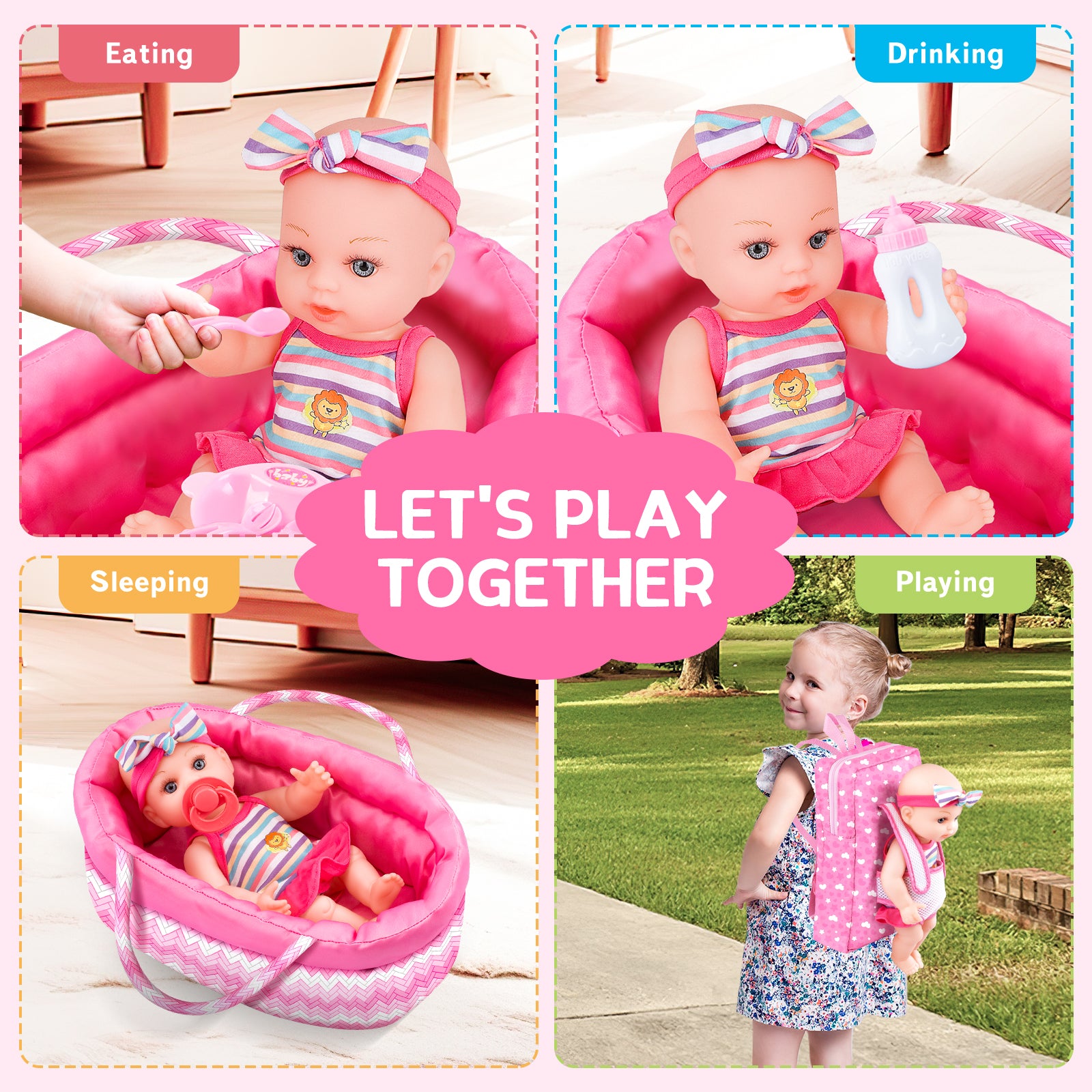 Crafted from safe and soft materials, our dolls are durable and designed to withstand active playtime. The lightweight yet stable structure of the doll bassinet ensures safety during use, while the plastic accessories are free from sharp edges for worry-free play.