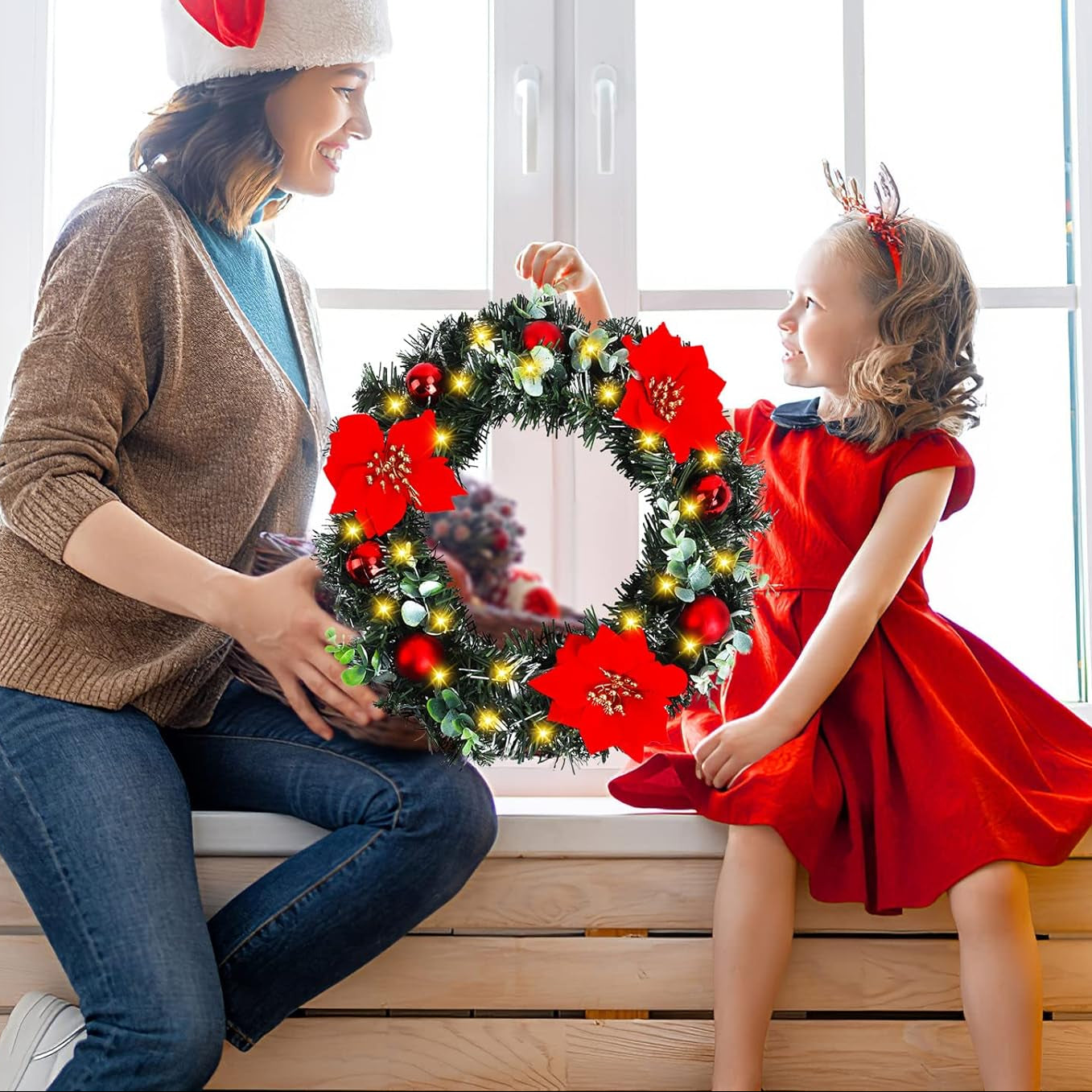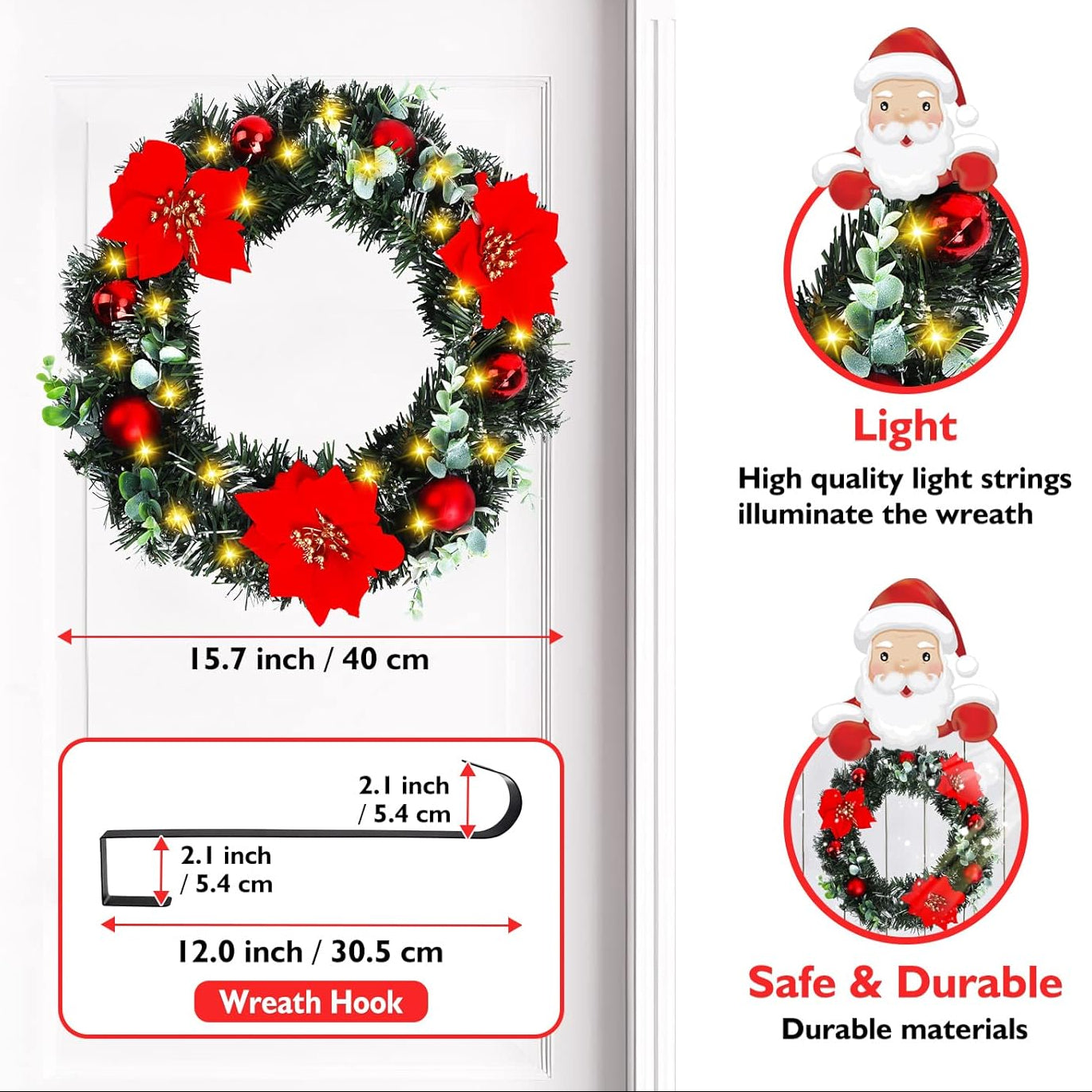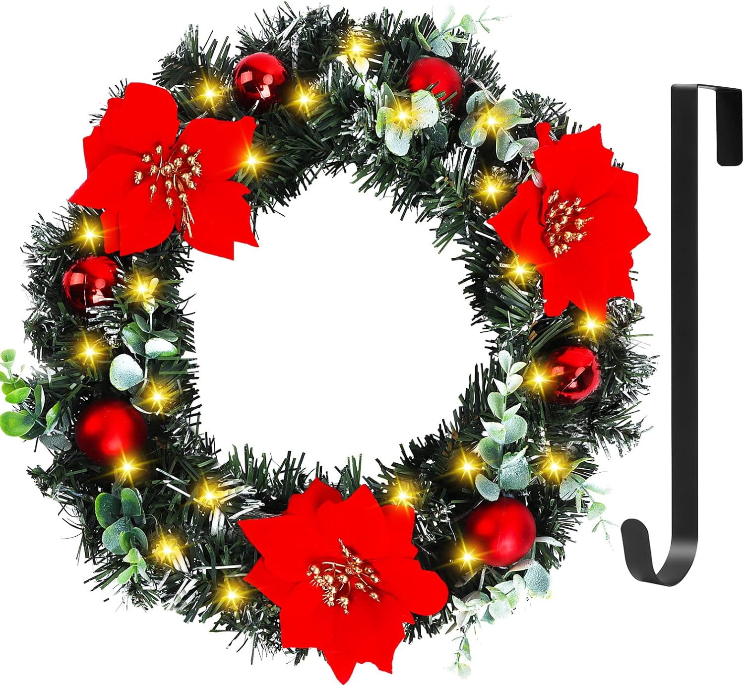 This Christmas wreath is illuminated by 30 warm-colored LED lights, creating a dazzling glow at night. Powered by two AA batteries (not included), it eliminates clutter. A convenient on/off button is located on the battery compartment. Our front door wreath adds a touch of brilliance to your home and is the perfect Christmas decoration.