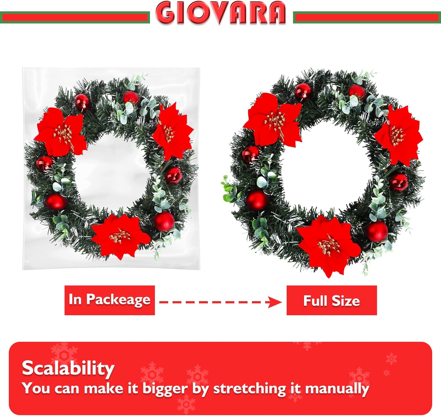 This beautiful Christmas wreath is the perfect addition to your fireplace, front door, window frames, staircase, entryway, and anywhere else! The GIOVARA Christmas wreath brings warmth and cheer to your family gatherings.