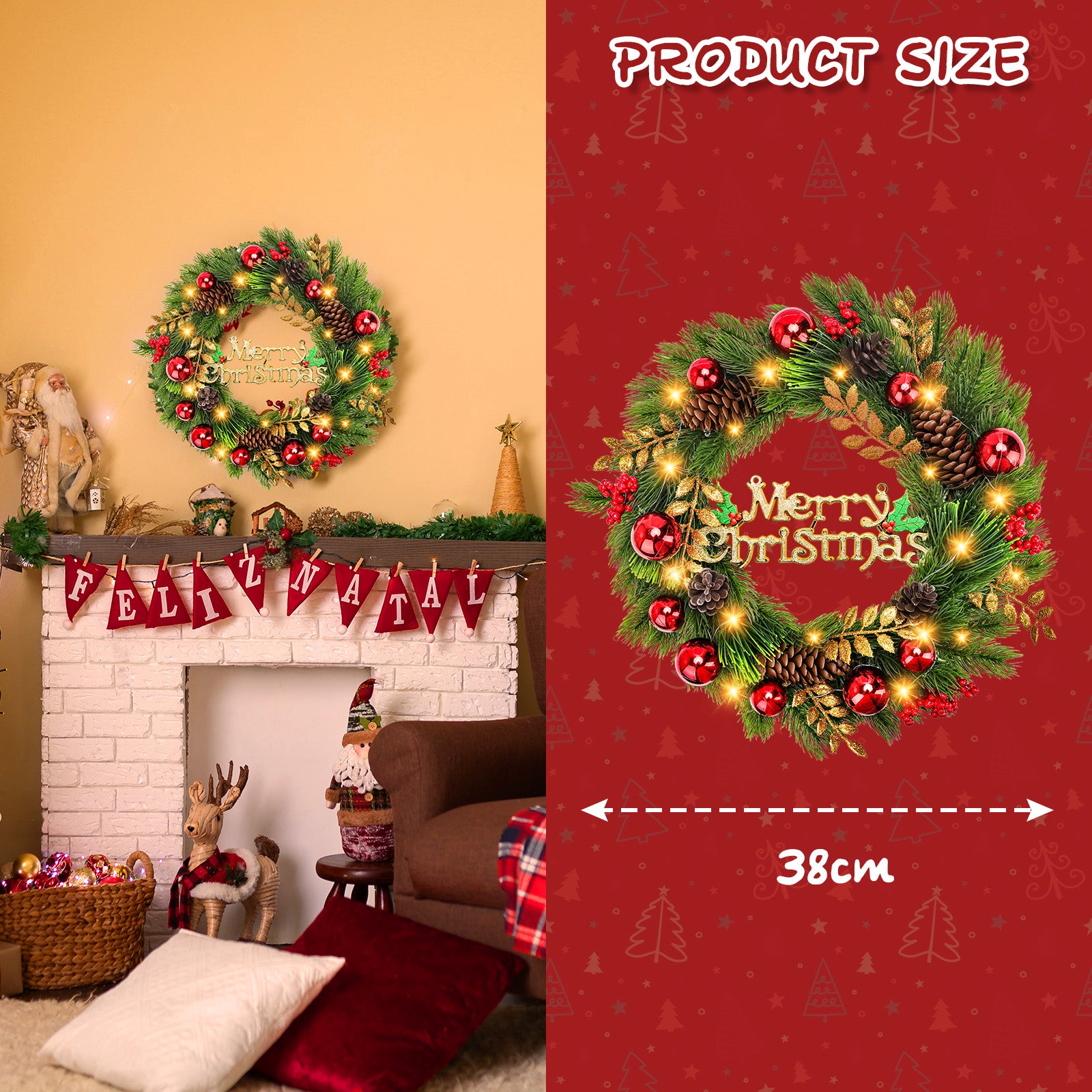 Festive & Elegant Design – Adorn your home with this lush Christmas wreath featuring realistic pine needles, red berries, glossy ornaments, natural pinecones, and sparkling golden leaves. Perfect for creating a warm, holiday atmosphere.