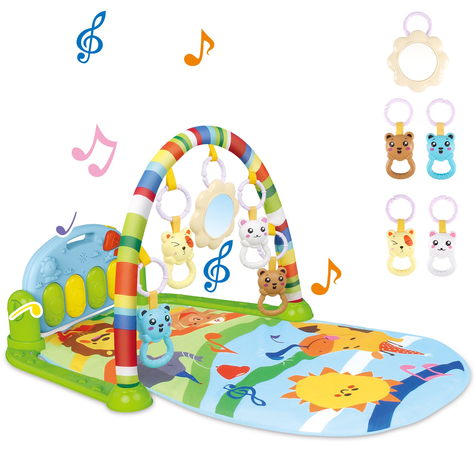 - ¡¾Promote Early Development¡¿Baby floor gym mat has 4 hanging animals and 1 hanging mirror which can stimulate colour recognition. A great way to help develop baby senses which will help to develop your child hand-to ¨Ceye coordination. Place the piano at the end of the playing mat allowing your child to kick the buttons making light and sounds.