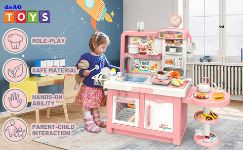 - 【Perfect gift for kids】 This kids kitchen set are made of non-toxic & environmental ABS plastic material. Safe and durable, won't hurt kids' tender skin. Smooth appearance, makes playing safer. Various vivid role play foods will attracts kids, great gift for birthdays, holidays or anniversaries. Good toys for boys girls aged 3, 4, 5 and up.