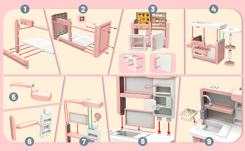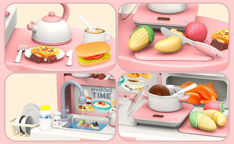 - 【MULTIFUNCTIONAL PLAY SET】This Toy kitchen set has Induction Cooktop, Electronic sink, microwave, coffee maker, Tea Party cake stand and more. A variety of food toys and play kitchen accessories for children to role-play,can be assembled or disassembled, and bring endless fun to children.