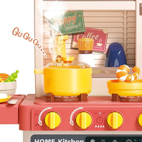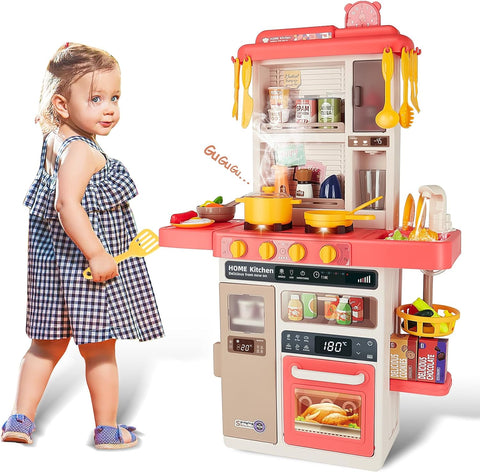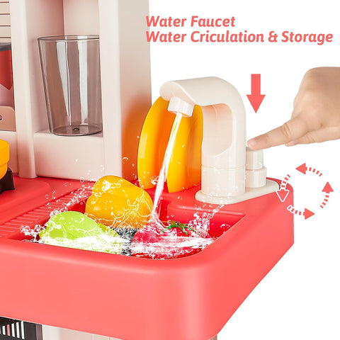 ¡¾MULTIFUNCTIONAL KITCHEN PLAY SET¡¿- With our pretend kitchen set the sink can store water; you can press the tap to dispense water like a real kitchen sink the water will drain into the circulation system to save water. This pretend play kitchen set has light and steam functions. The steam will come from the hobs once turned on creating a realistic experience as though your child is cooking, with music and realistic sound the hobs will also light up.