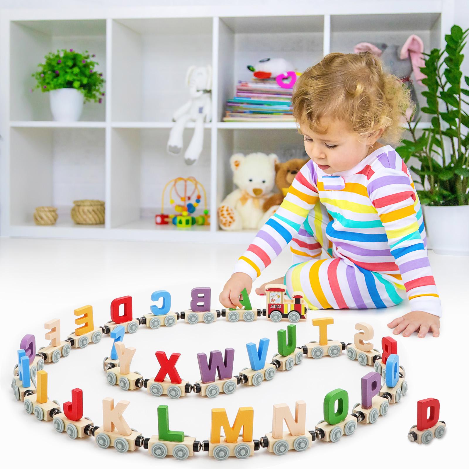 - 27 Magnetic Wooden Train Cars – Includes A–Z letter cars + 1 engine car. Magnetic couplings make it easy for children to connect, build, and rearrange their own alphabet train.